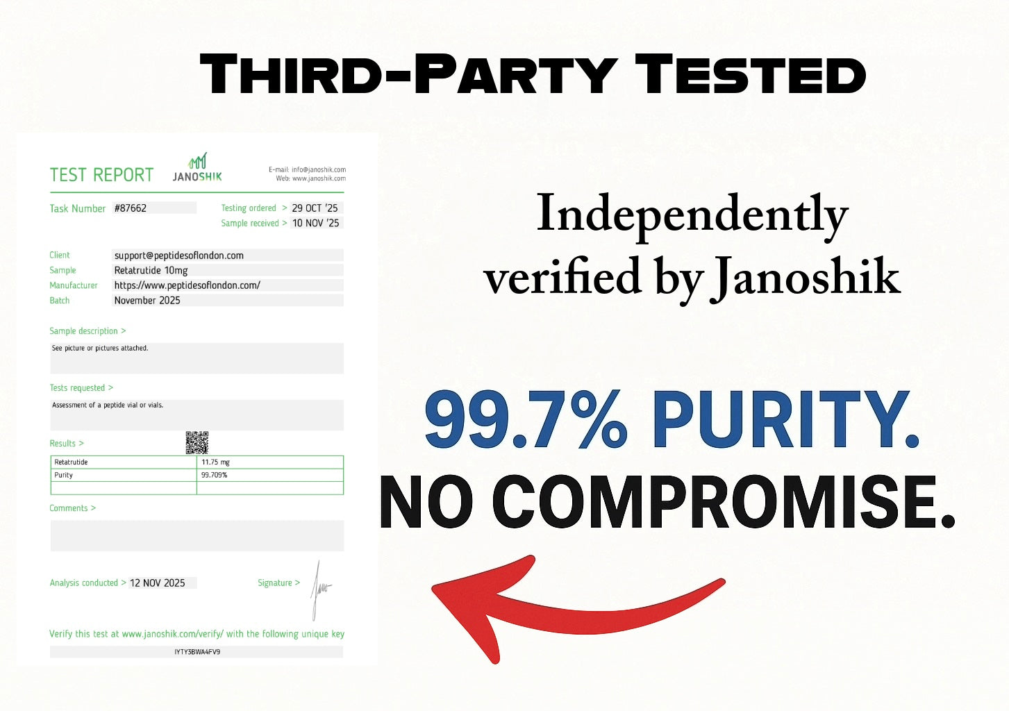 All products sold by Peptides of London are strictly intended for laboratory research purposes only. They are not intended for human consumption, therapeutic use, diagnostic procedures, or clinical applications of any kind.